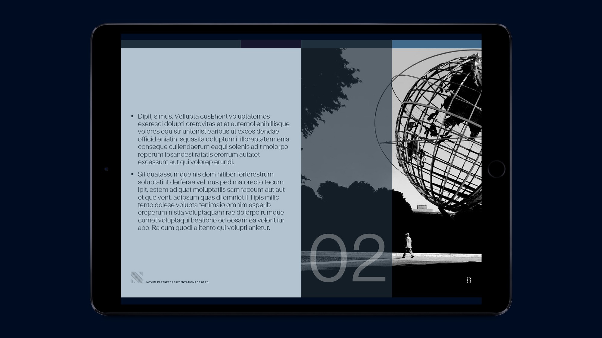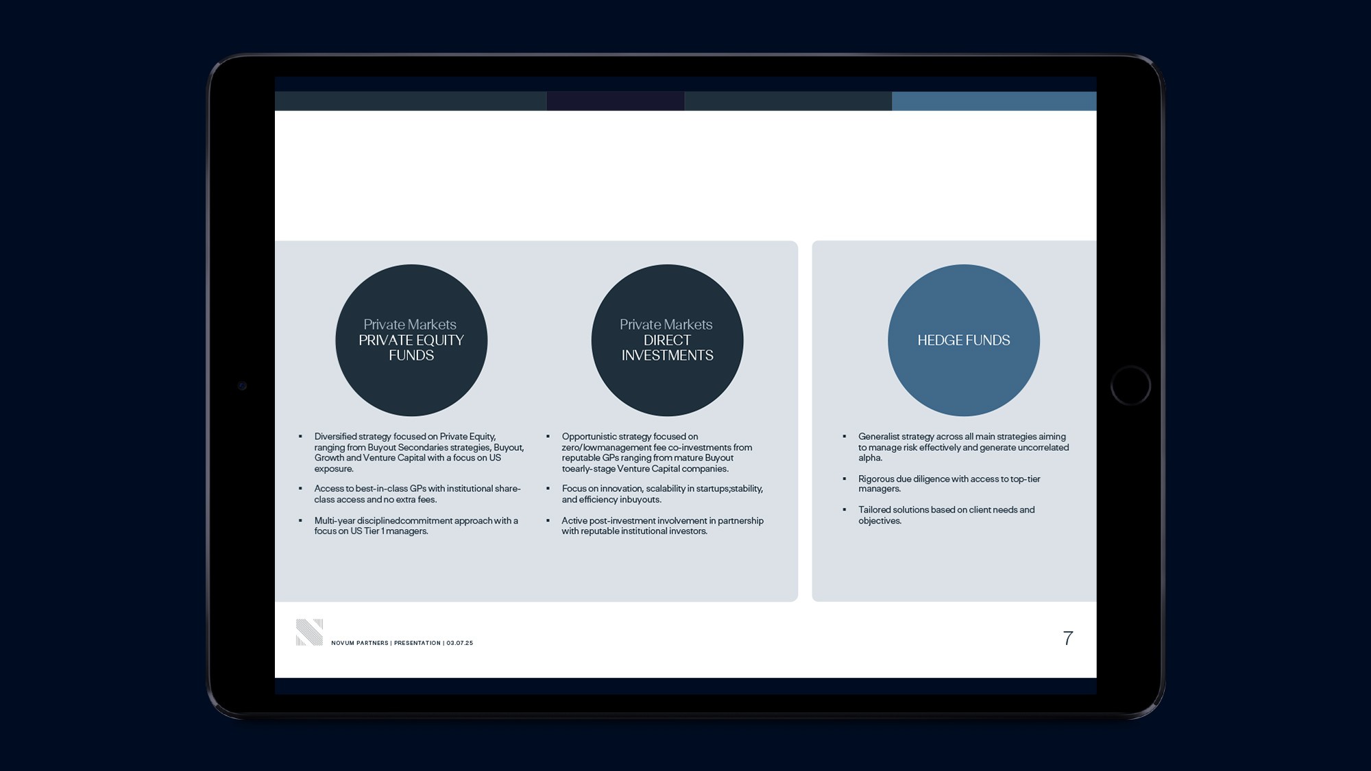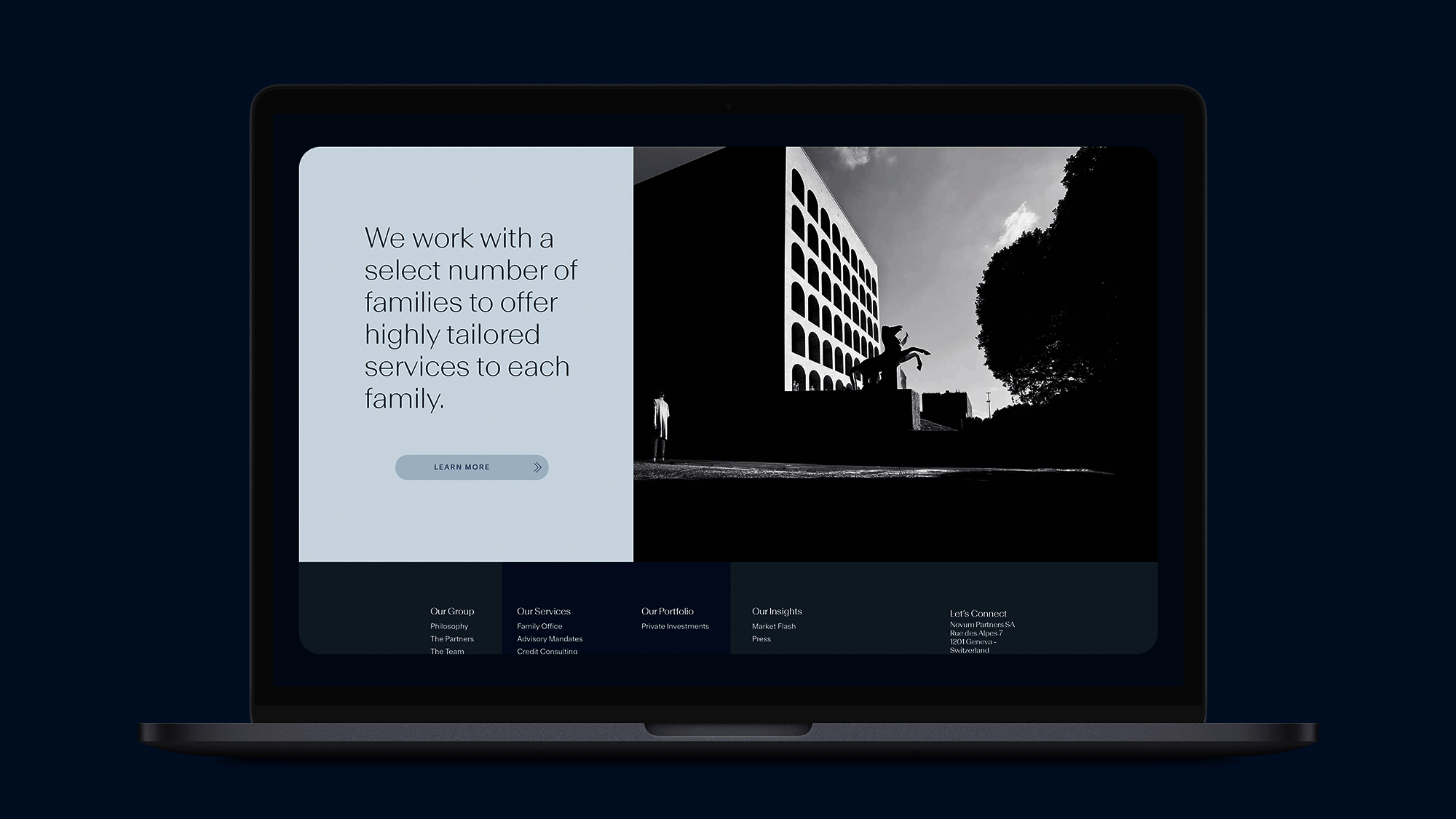 Novum Partners invests across all growth stages, partnering with venture capital and private equity funds while offering bespoke services for families and high-growth companies. The challenge: to build a strong visual identity and coherent language system around an existing logo, reflecting the firm’s expertise, discretion, and diversified approach. The solution: an integrated system including website design and presentation slide templates, establishing clarity, elegance, and consistency across all client-facing communications.